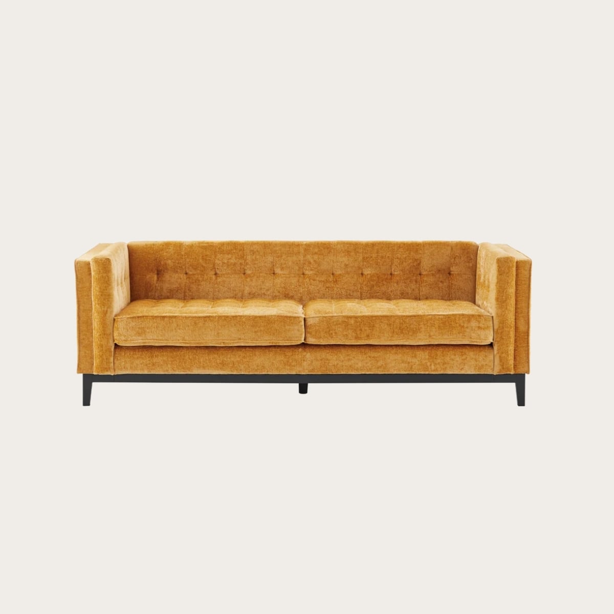 Mustard yellow is one of those colors that photographs boldly but reads incredibly sophisticated in person. This sofa has clean parallel lines, square armrests, and a structured, almost architectural presence. The chenille velvet upholstery is soft to the touch and more durable than traditional velvet. If you want your living room to feel intentional and unafraid, this is your sofa.