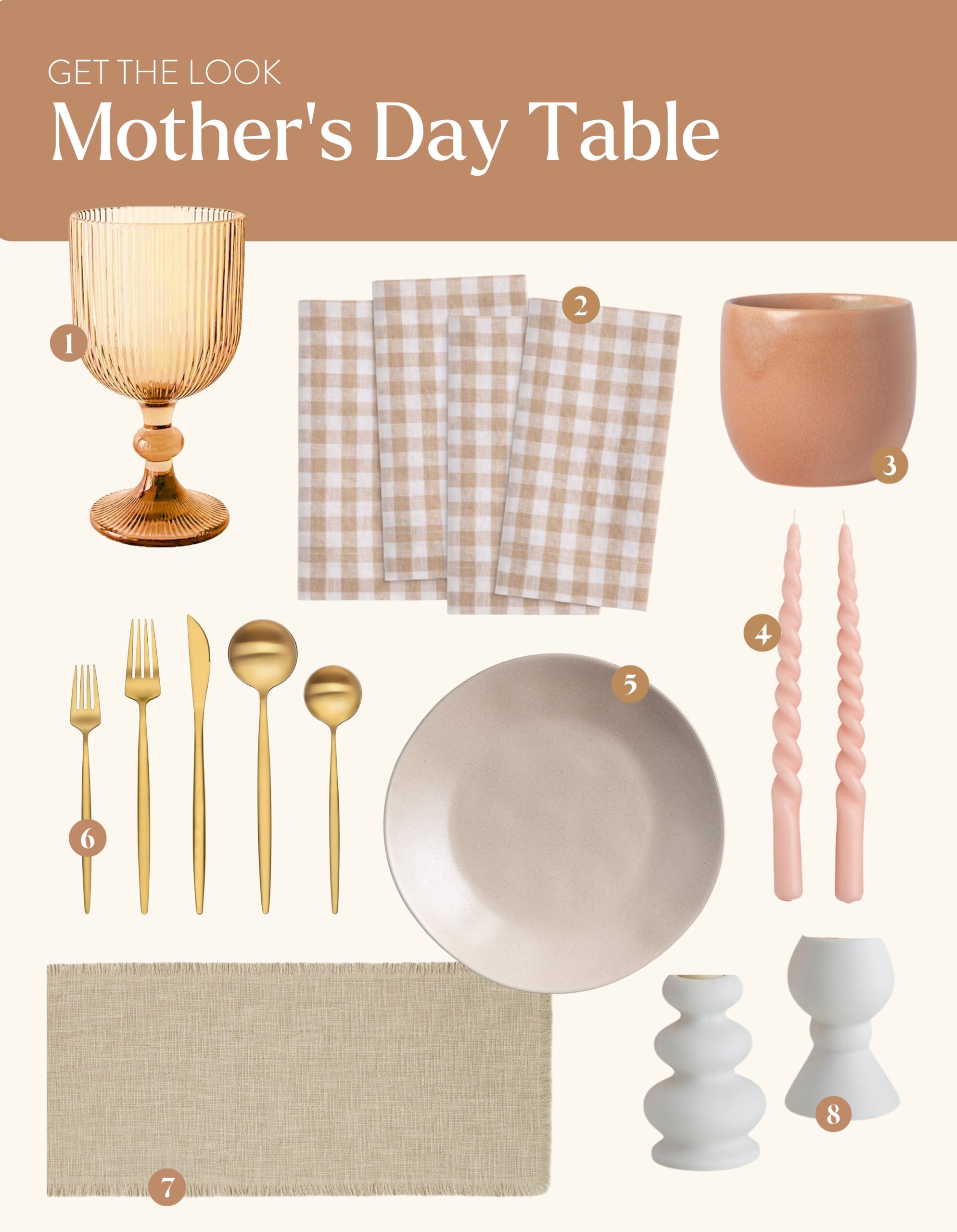 While opting for a matching dinnerware set is certainly a fine option, I like to mix up my plates and bowls for a more unique table setting with a lived-in feel. Pair a dinner plate with a bowl or salad plate in a complementary shade (I went with white and beige) or use two highly contrasting colors to really make your table pop. This layered look creates depth and gives your Mother’s Day brunch table that effortlessly curated feel without spending a fortune.